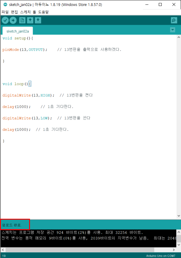 해당 코드를 업로드해서 잘 작동되는지 확인해볼텐데, 오늘은 아두이노의 내장된 led를 이용해 확인해보도록 하겠습니다.