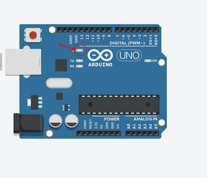 아래 사진을 보시면 동그란 부분이 13번 핀에 연결된 LED인데 아래 코드를 이용해 해당 LED를 깜빡여보겠습니다.