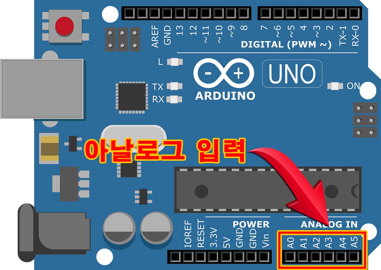 아날로그 입력 포트는 총 6개로 구성되어 있으며 보드에는 A0번부터 A5번까지 표기되어 있습니다. 입력 포트이니 정보가 해당 핀으로 들어간다는 뜻이 되고, 보드에도 아날로그 인 (아날로그형태의정보가 들어간다)/ANALOG IN이라고 친절하게 문구가 적혀 있습니다.