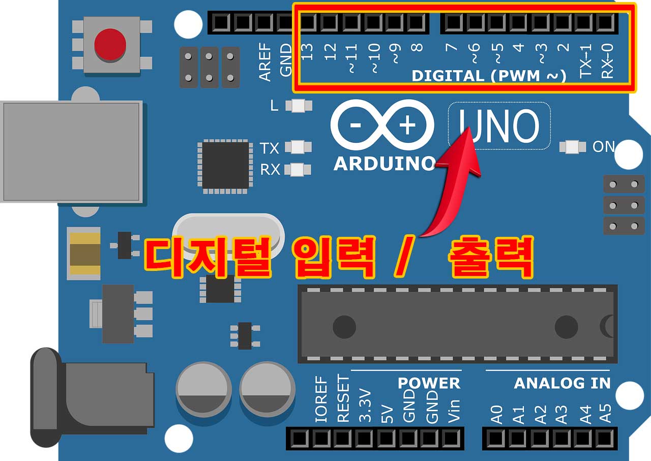 0~ 13번까지 모두 디지털 입력으로 또는 디지털 출력으로 사용가능하고, ~ 물결표시가 있는것은 아날로그 출력으로도 사용할 수 있습니다. 그러니 내가 어떠한 용도로 쓰고 싶다고하면 해당핀에 점퍼선을 연결하고 코딩을 진행하시면 됩니다.